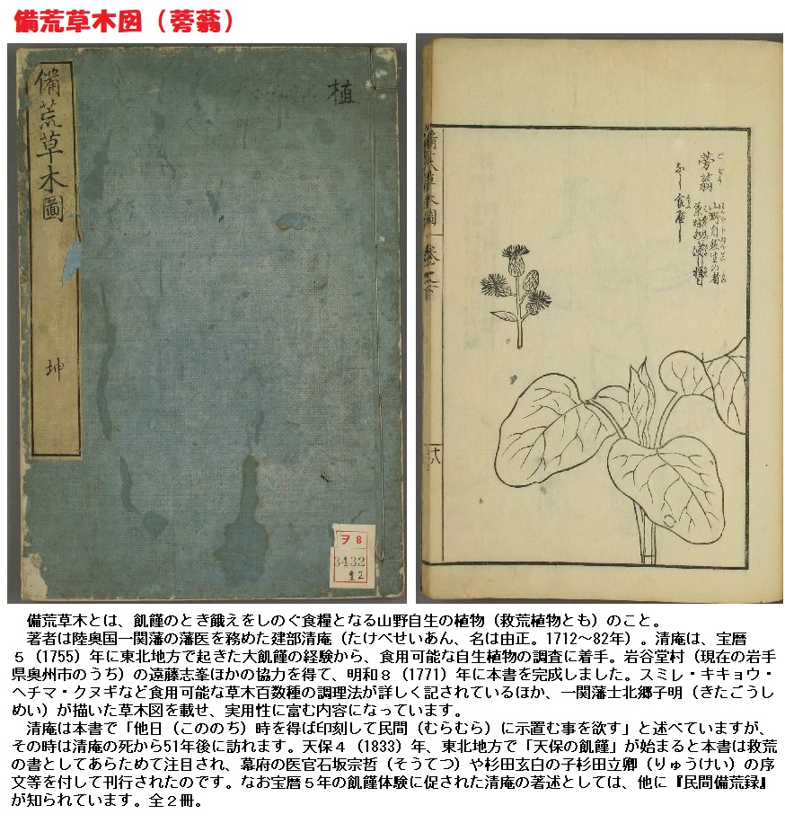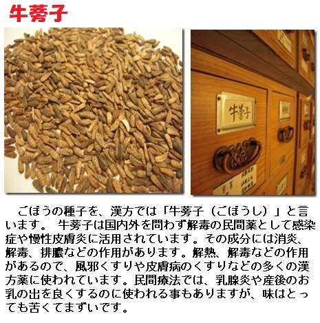 「備荒草木図びこうそうもくず」に野山に自生するものは、葉をゆでて食べると良い」と書かれています。このようにごぼうは、根だけではなく、葉も薬草として利用されてきました。