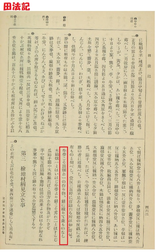 江戸時代の松江藩地方役(ジカタヤク)岸崎作久治が天和2(1682) 年に著した農政書「田法記」には、「牛蒡こそ田畑一の作りもの銀に積もりて並ぶものなし」とも記され、価値の高い野菜だったことが伺えます。
