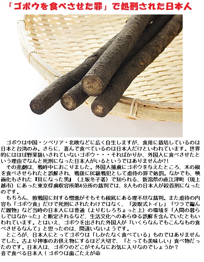 西洋では牛蒡の若葉をサラダに使うことはありますが、根を食材とするのは日本と韓国くらいで、太平洋戦争中、苦労して採ってきたごぼうをアメリカ人捕虜に食べさせたところ、捕虜は木の根を食べさせられたと勘違いしたという話もあります。