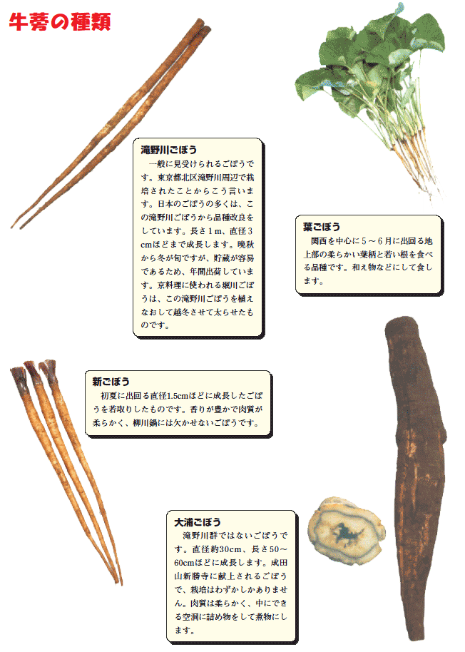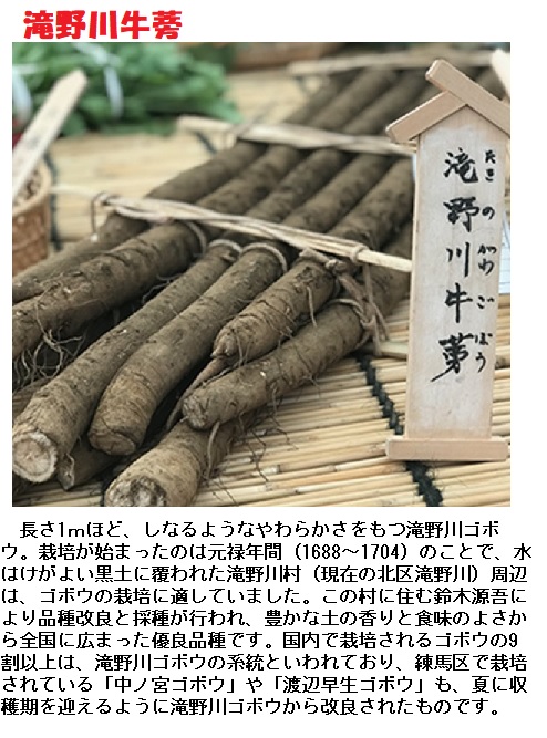 滝野川-最も一般的なゴボウで細く長いゴボウの代表です。東京の滝野川で鈴木源吾と言う人が作りました。太さは2~4cmで長さは80cm程度。 長いものでは1.5mに達します。現在売られているゴボウのほとんどはこの滝野川を改良したものだそうです。