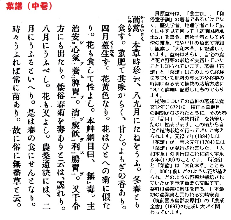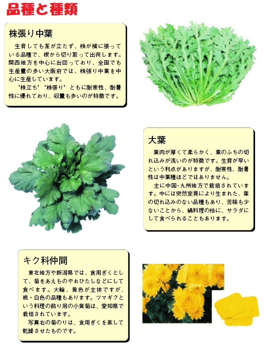 いずれにしても春菊は室町時代までには伝わっていたとされ、江戸時代の農書「農業全書」や「菜譜」には栽培方法が記載されています。
