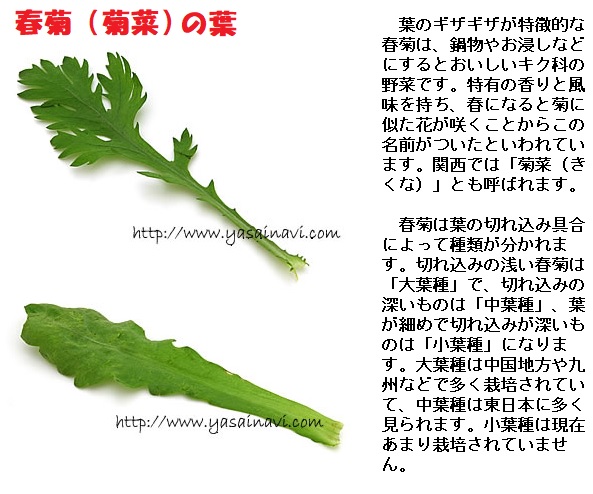 シュンギク(春菊、Glebionis coronaria)は、キク科シュンギク属に分類される植物です。原産地は地中海沿岸です。春に花を咲かせ、葉の形がキク(菊)に似ていることから春菊と呼ばれています。葉に切れ込みの少ない大葉(おおば)が四国・九州で(また「おたふく」・「ろーま」とも呼ばれる)、切れ込みのある中葉(ちゅうば)がそれ以東でそれぞれ栽培されています。中葉はさらに、株立ち型と株張り型とに分かれます。香りと葉や花の形から、関西では菊菜(きくな)とも呼ばれます。稀に新菊(しんぎく)と表記されることもあります。