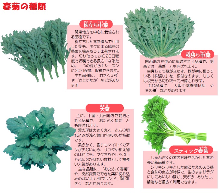 春菊の生産地としては、千葉と大阪が年間収穫量の1位と2位を競っています。作付け品種は、千葉・茨城・群馬などの関東エリアと、大阪・福岡の西日本エリアに大別できるでしょう。前者は株が立ち、葉が中位の大きさで切れ込みが多い「株立ち中葉」がメインです。後者は大阪が「中葉春菊」、福岡が「大葉春菊」と、共に茎が立たずに葉のみを食す春菊の特産地となっています。