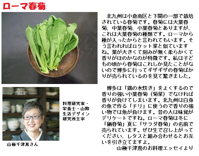 福岡の「大葉春菊」は北九州市周辺に畑が多く、お隣の山口県下関市との関係性も大きいようだ。下関は有名なフグの産地。アクが少なく、さっと湯にくぐらせれば美味しくいただける大葉春菊は、フグちりには欠かせない食材とされてきました。
