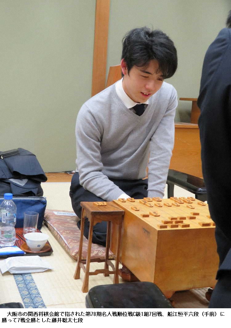藤井聡太七段 7戦全勝で単独首位に 第78期名人戦順位戦C級1組 ―― 将棋の藤井聡太七段(17)が3日、大阪市の関西将棋会館で指された第78期名人戦順位戦C級1組7回戦で船江恒平六段(32)に78手で勝ち、7戦全勝とした。終局は午後11時16分。