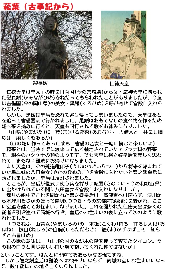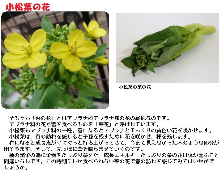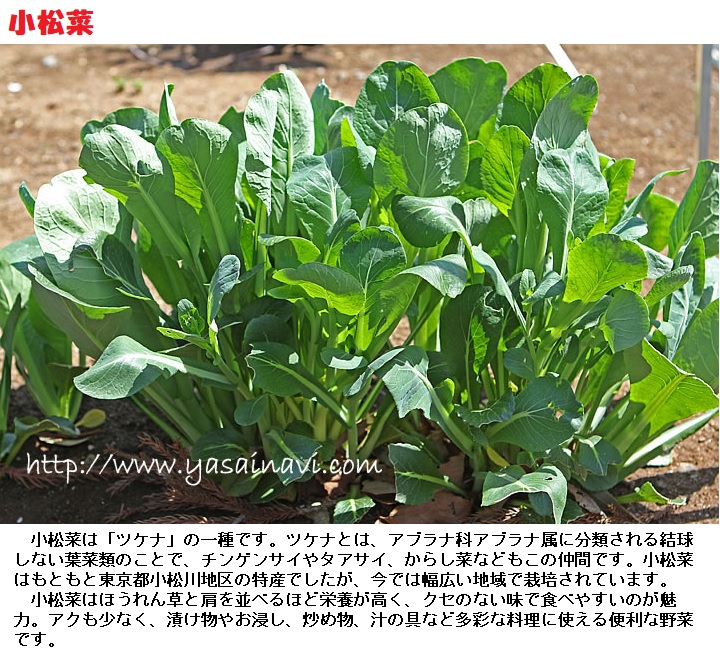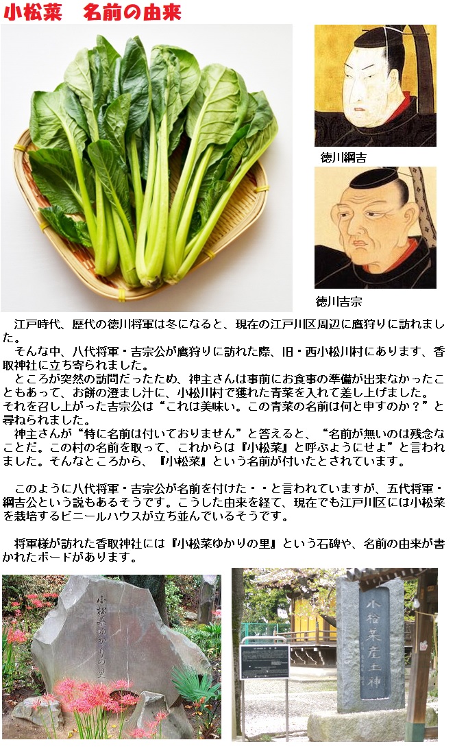小松菜は、江戸時代、武蔵国葛飾郡小松川村(現在の東京都江戸川区小松川付近)で多く栽培されたことにちなむとされます。徳川綱吉(吉宗の説もあり)に献上された際、この地名から「小松菜」と名付けられたともいわれるが定かではない。小松菜の別名「鶯菜」は、3~4月に出荷されるため「鶯の鳴く頃の菜」の意味です。