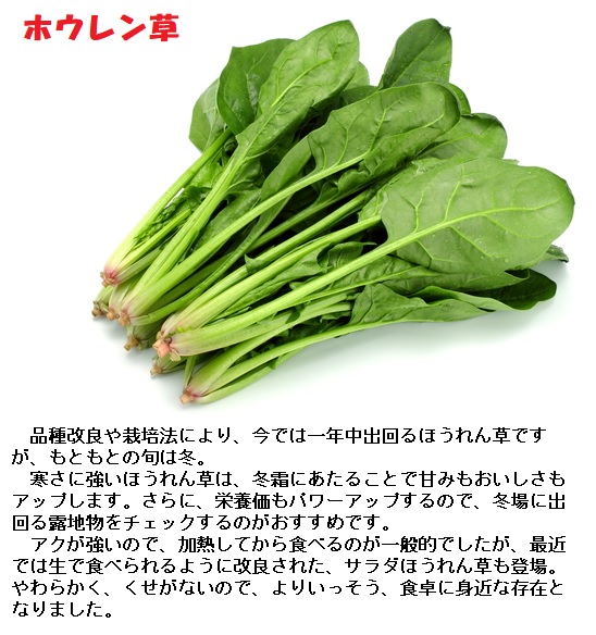 ホウレンソウ(菠薐草、学名:Spinacia oleracea)は、ヒユ科アカザ亜科ホウレンソウ属の野菜です。雌雄異株。高温下では生殖生長に傾きやすくなるため、冷涼な地域もしくは冷涼な季節に栽培されることが多い。冷え込むと軟らかくなり、味がよりよくなります。