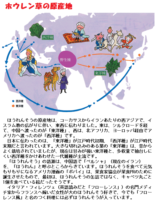 ペルシャで栽培されていたほうれん草は、東西に分かれて長い期間をかけて広まり、ヨーロッパ方面で西洋種が、中国方面で東洋種が形成されていった。ヨーロッパへは12世紀に北アフリカから渡り、16世紀にはヨーロッパ全土に広まったと考えられている。東アジアへはシルクロードを通って広まり、7世紀頃に中国へ伝播。日本へは江戸時代に中国から入ってきた。江戸時代末期には日本にも西洋種が入ってきましたが、アクの強さからあまり好まれず、広まらなかったようです。