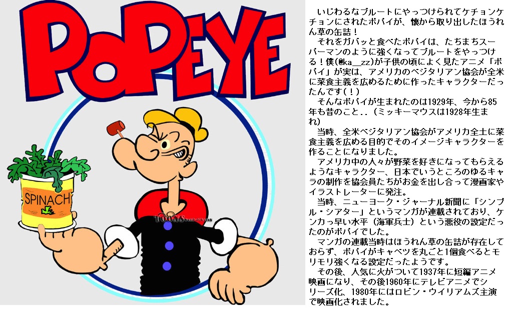昭和の初めくらいまではそれほど一般的ではなく、同じ葉野菜なら小松菜のほうが人気だったようです。日本でほうれん草の需要が伸びたのは第二次大戦後です。きっかけはアニメの「ポパイ」。主人公がピンチの時にほうれん草の缶詰を食べることから、「ほうれん草=パワーアップ」というイメージが日本でも広まり、一気に定番野菜の仲間入りをしました。品種改良が進み、栽培しやすく食べやすくなったことも要因でしょう。