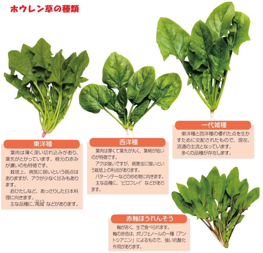 日本では西洋種(葉が厚く、丸みを帯びている)と東洋種(葉が薄く、切り込みが多く、根元が赤い)の2種類が栽培されていますが、東洋種は病気と寒さに弱く、虫が付きやすいので栽培が難しいという理由により、ここ数十年の間に急速に西洋種もしくは西洋種の一代雑種に取って変わりました。現在国内のスーパーで見かけるほうれん草は大半が西洋種ですが、東洋種の味の良さが近年見直されつつあるそうです。