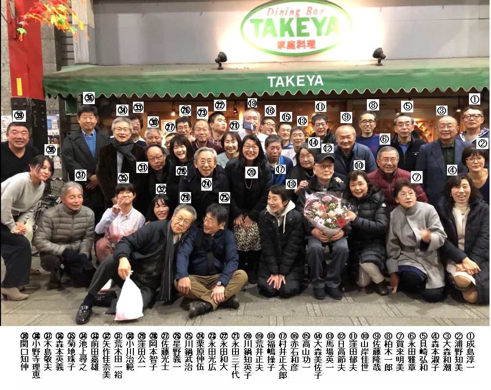 昨日の忘年会の全員写真で、全員が入っているものがありましたので、添付しておきます。年代が離れ、名前の判らないという方もいますので、名前入りのもの添付しておきます。