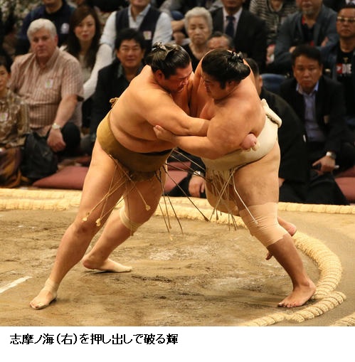 ▽志摩ノ海に輝は、輝が押し出しで勝って7勝2敗です。