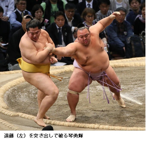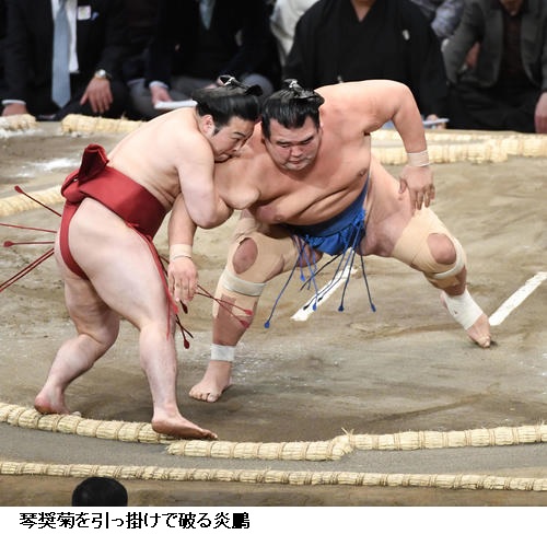 ▽琴奨菊に炎鵬は、炎鵬が引っ掛けで5勝目。