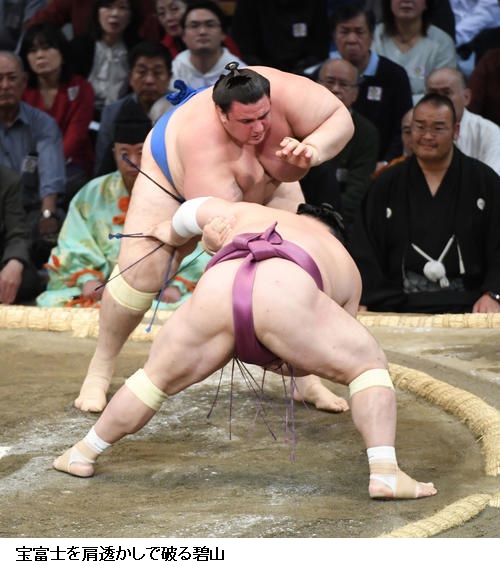 ▽碧山に北勝富士は、北勝富士が押し出し。碧山は負け越しです。