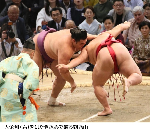 ▽大栄翔に朝乃山は、朝乃山がはたき込みで勝って7勝2敗としました。
