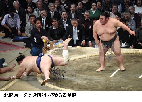 ▽大関 貴景勝に北勝富士は、貴景勝が突き落としで6勝目。