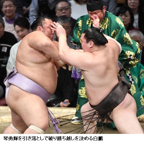 ▽琴勇輝に横綱 白鵬は、白鵬が引き落としで勝って、ただ1人1敗を守って勝ち越しを決めました。 (NHK WEB NEWS 2019年11月18日 19時52分)