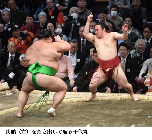 ▽炎鵬に千代丸は千代丸が突き出しで7勝目。