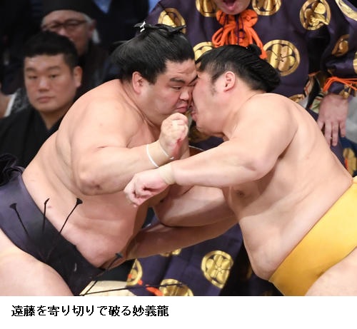 ▽遠藤に妙義龍は妙義龍が寄り切り。