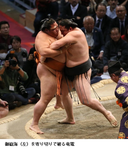 ▽竜電に御嶽海は竜電が寄り切り。御嶽海は5敗目です。