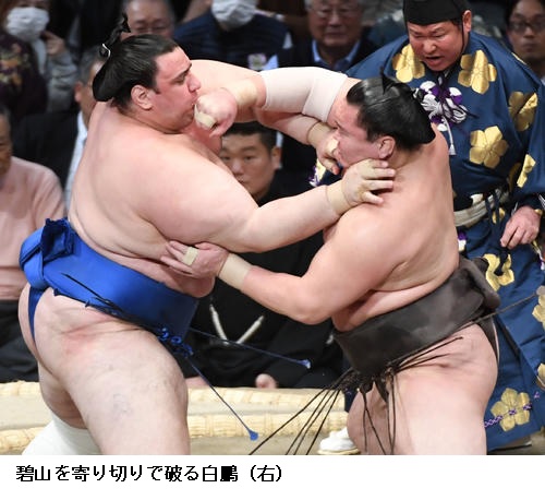 大相撲九州場所10日目 横綱 白鵬が1敗守る ―― 大相撲九州場所は10日目。横綱・白鵬は碧山に寄り切りで勝ってただ1人1敗を守りました。