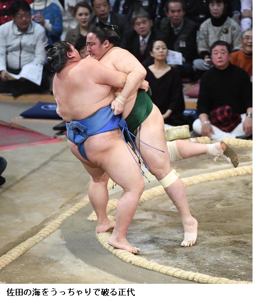 ▽正代に佐田の海は正代がうっちゃりで勝って勝ち越しを決めました。