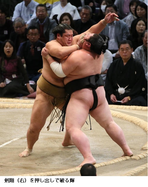 ▽剣翔に輝は輝が押し出しで勝って勝ち越しました。