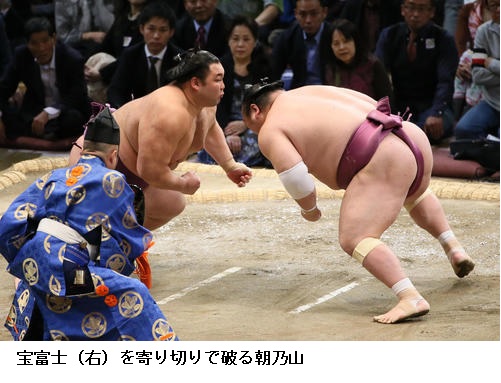▽宝富士に朝乃山は朝乃山が寄り切りで勝って9勝目を挙げました。