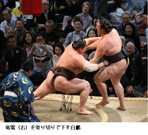 ▽竜電に横綱 白鵬は白鵬が寄り切りで勝ってただ1人1敗を守りました。