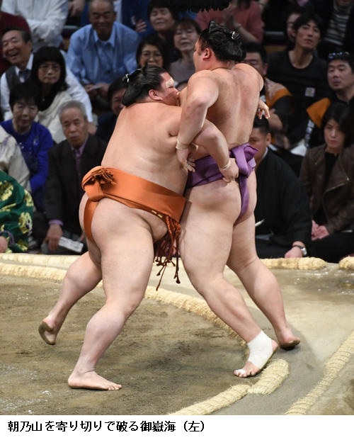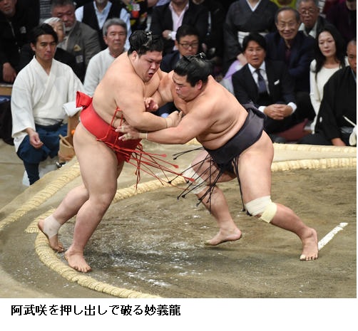 ▽妙義龍に阿武咲は妙義龍が押し出しで勝ち越し。阿武咲は負け越しです。