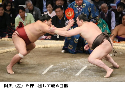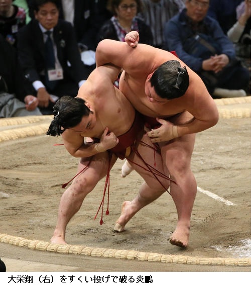 ▽大栄翔に炎鵬は炎鵬がすくい投げで勝ち越しました。白鵬に勝った大栄翔は初の殊勲賞を獲得しました。