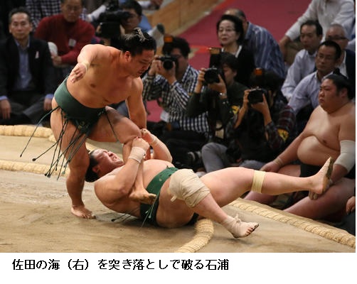 ▽佐田の海に石浦は、石浦が突き落としで勝ち越しました。