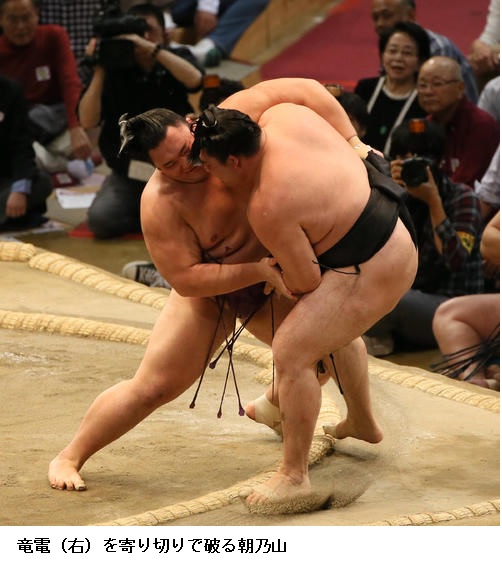 ▽朝乃山に竜電は、朝乃山が寄り切りで勝って11勝目をあげました。竜電は負け越しました。