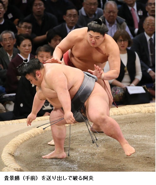 ▽阿炎に大関 貴景勝は、阿炎が送り出し。阿炎は勝ち越しです。