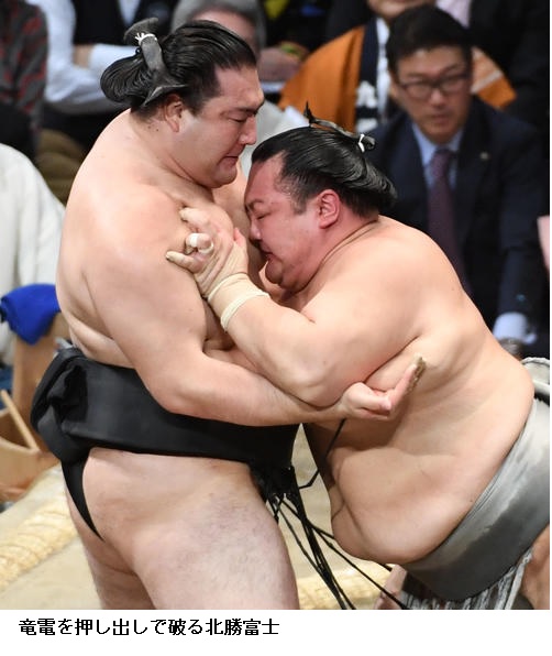 ▽北勝富士に妙義龍は妙義龍が突き落としで勝ちました。