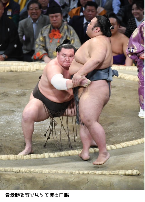 ▽大関 貴景勝に横綱 白鵬は白鵬が寄り切りで勝って14勝1敗で優勝に花を添えました。大関に復帰した貴景勝は9勝6敗でした。