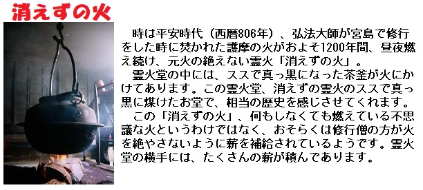 大同元年(806年)、弘法大師が弥山山頂で百日間に及ぶ求聞持(ぐもんじ)の秘法を修して以来、今日まで途絶えることなく燃え続ける霊火。この火で沸かした霊水は万病に効くと言われています。また、明治34年(1901年)に操業を始めた八幡製鉄所の溶鉱炉の種火や広島市の平和記念公園の「平和の灯」の元火にもなりました。