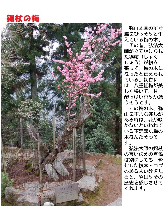 弥山本堂のすぐ西の脇にある八重咲きの紅梅。弘法大師が立てかけた錫杖が根をはり、ついには梅の木になったという伝説が残っています。毎年美しい花を咲かせますが、山内に不吉な兆しがあると咲かないとも言われています。