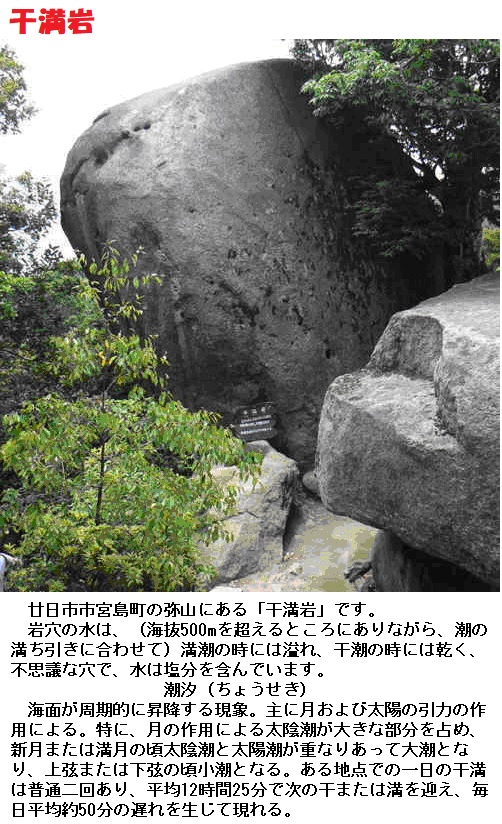 弥山山頂から大日堂に向かって下りる西側の道を少し下ったところにある巨岩で、その名の通り、側面にあいた直径10cm程の穴に溜まった水が潮の満ち引きに合わせ上下するといわれます。さらにはその水には塩分が含まれているとか。岩穴は標高約500mの地点にあり、いまだに科学的な証明がなされていない不思議な現象です。