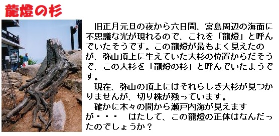 旧正月初旬の夜になると宮島周辺の海面に現れる謎の灯りを龍燈と言い、この龍燈が最もよく見える弥山頂上の大杉は「龍燈の杉」と呼ばれていました。現在この杉は枯れてしまったものの、それらしき根株が残されています。
