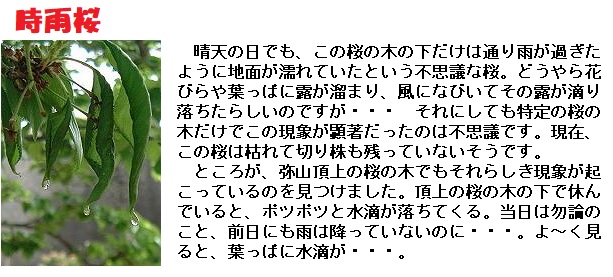 どんな晴天の日でも時雨のように露が落ち、地面は通り雨が過ぎ去ったように濡れる不思議な桜。残念なことに伐採され、現在は見ることができません。