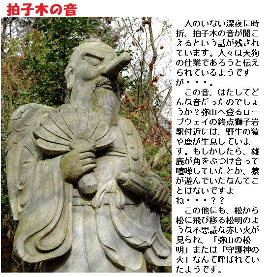 カチーン、カチーン。人気のない深夜、どこからともなく拍子木の音が聞こえてくると言われています。弥山に棲む天狗の仕業と語り継がれ、音が鳴っている間は家にこもっていないとたたりがあると恐れられていたそうです。