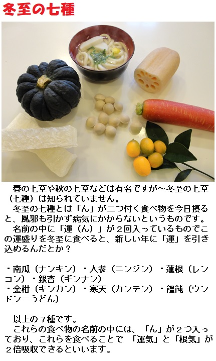 冬至の七種(運が倍になるという意味で「ん」が2つ付く食べ物)です。