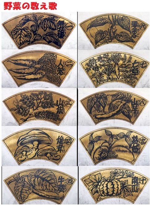 ①無花果(イチジク) ②人参(ニンジン) ③山椒(サンショ) ④椎茸(シイタケ) ⑤牛蒡(ゴボウ) ⑥零余子(ムカゴ) ⑦七草(ナナクサ) ⑧山芋(ヤマイモ) ⑨慈姑(クワイ) ⑩南瓜(カボチャ)