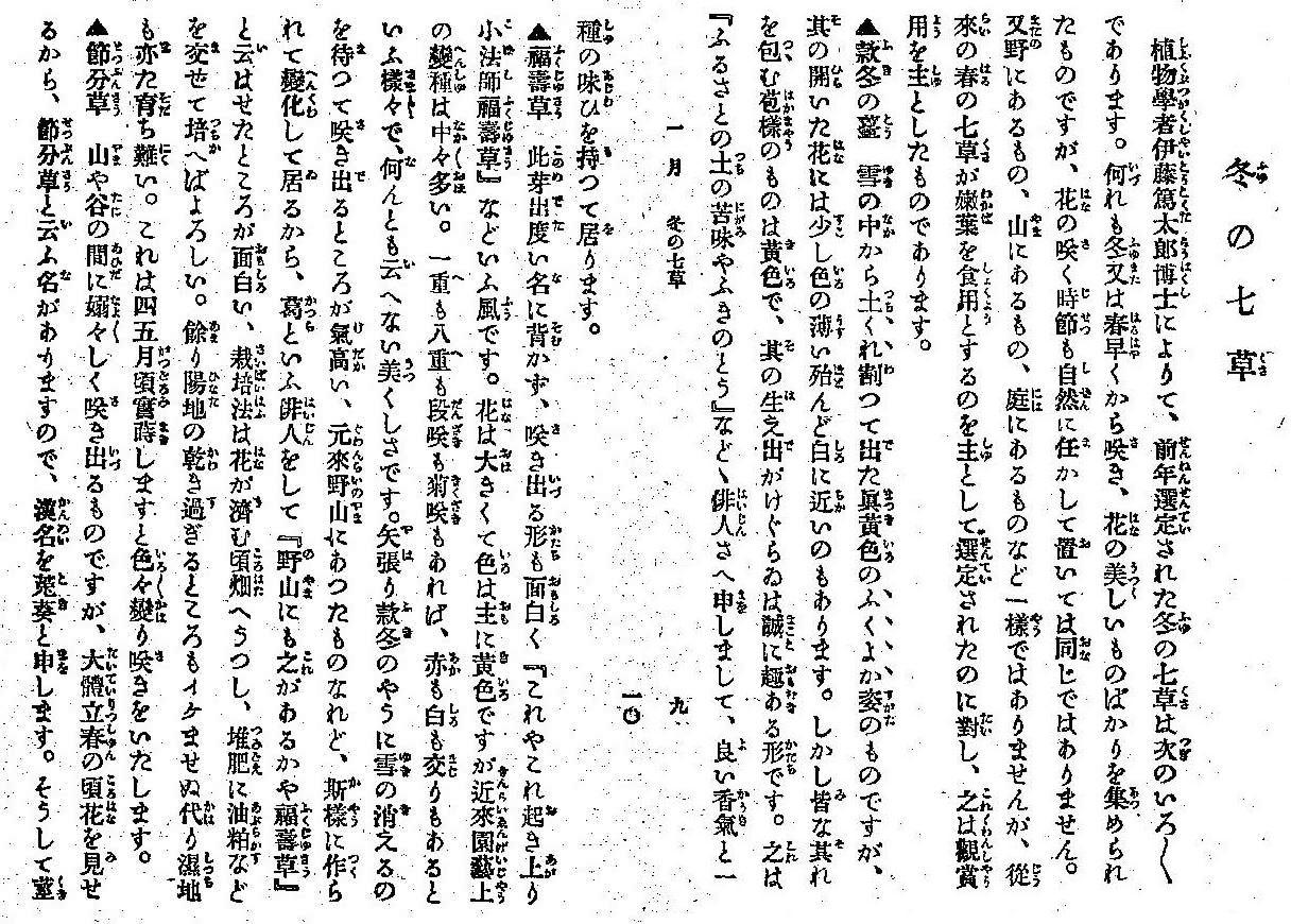 冬の七草は、春の七草や秋の七草ような古事に基づくものは見られませんが、明治41年(1908年)に久田二葉が書いた「園芸十二ケ月」に、『植物学者伊藤篤太郎博士が、先年冬の七草を選定した』とするものがあります。