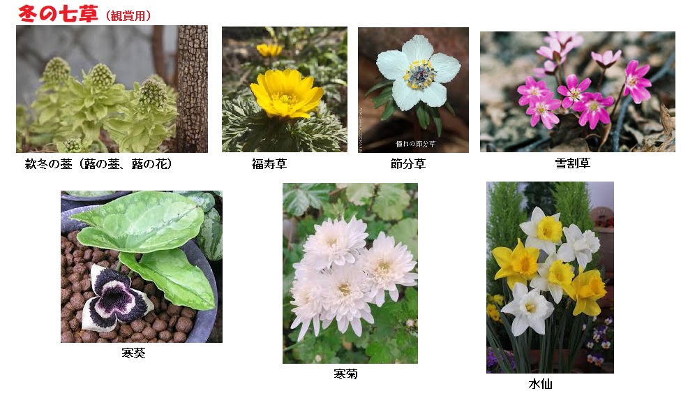 それによれば、冬の七草は「款冬の薹(ふきのとう)」「福寿草」「節分草」「雪割草」「寒葵」「寒菊」「水仙」の七種としています。