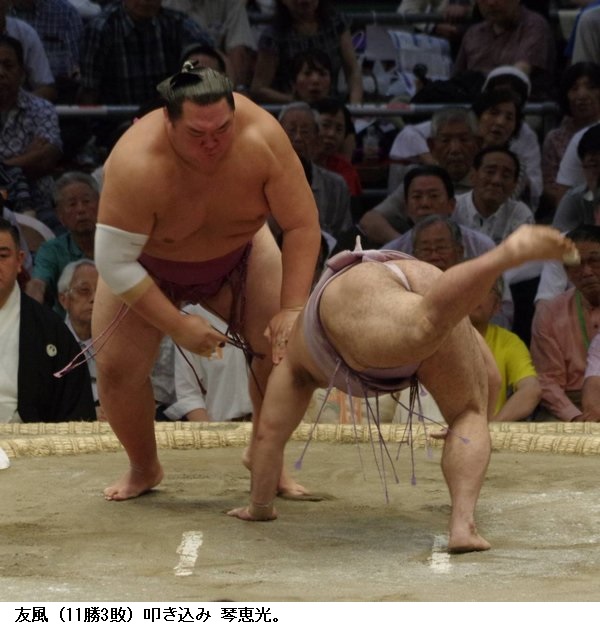 △友風に琴恵光は友風がはたき込みで勝ちました。19日に横綱 鶴竜を破った友風は11勝目を挙げました。