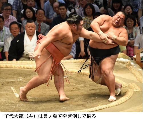 △千代大龍に豊ノ島は千代大龍が突き倒しで勝って勝ち越し。返り入幕の豊ノ島は負け越しです。