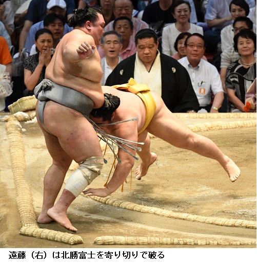 △遠藤に北勝富士は遠藤が寄り切りで勝って3場所ぶりにふたけたの10勝を挙げました。