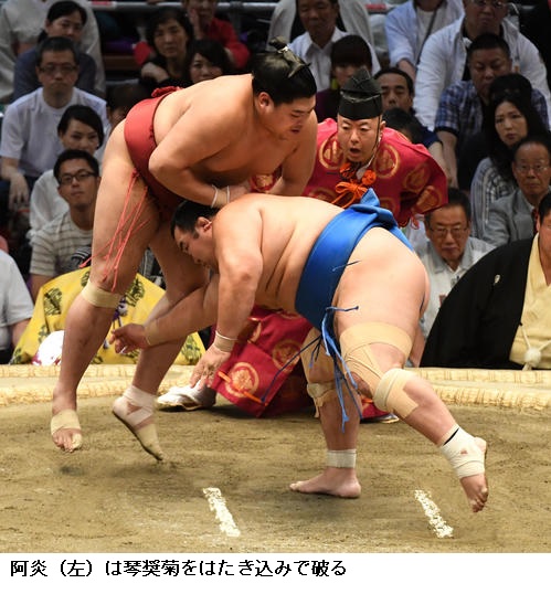 △阿炎に琴奨菊は新小結の阿炎がはたき込みで勝って勝ち越しました。琴奨菊は負け越しです。